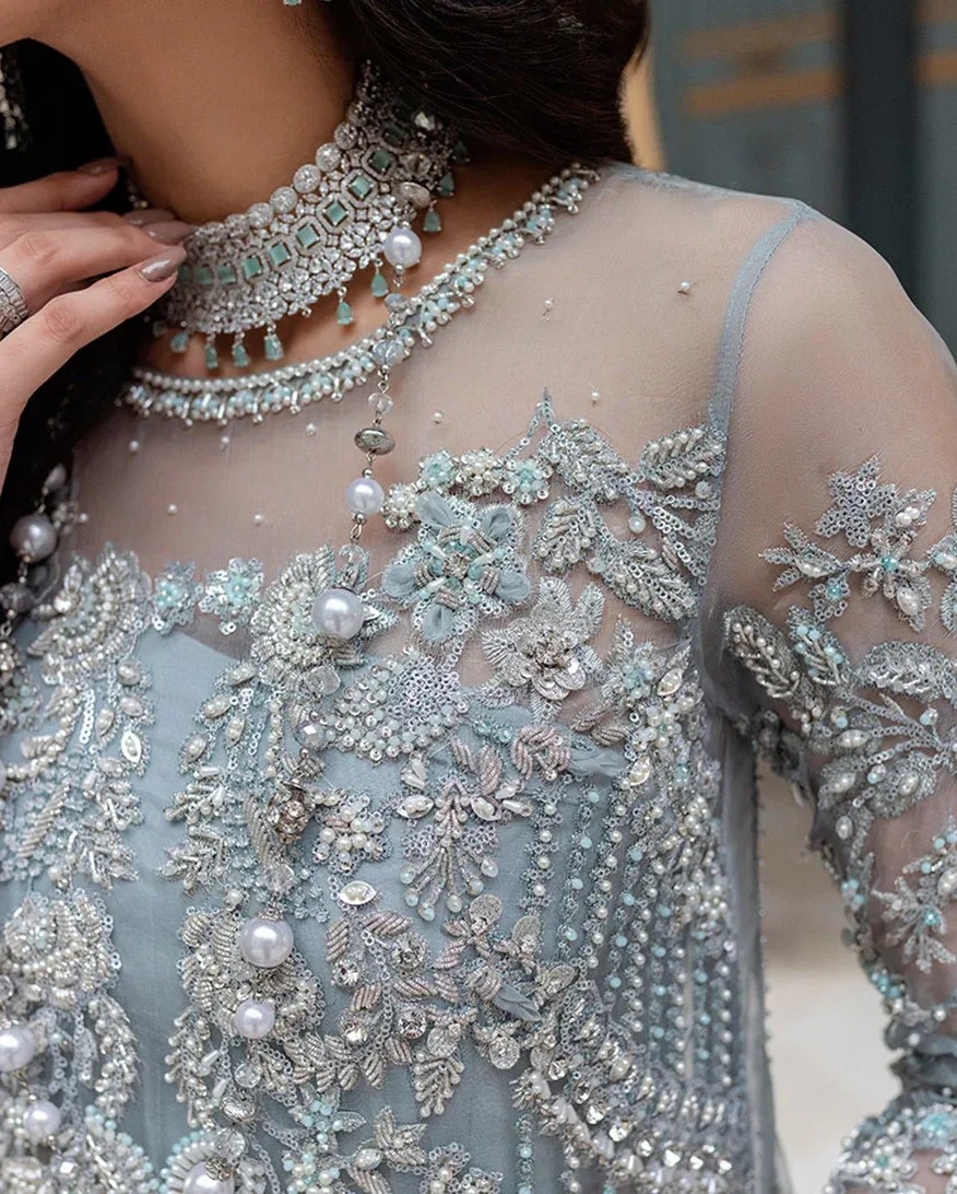 This ice blue long shirt crafted from pure silk organza is heavily ornamented with Crystal's and thread work. This luxurious outfit is finished with raw silk pants and a pearl embellished dupata for an ethereal look.