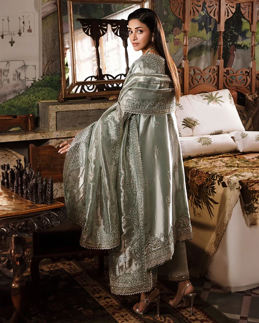 Indulge in ethereal elegance with our sea green silk ensemble, adorned with exquisite hand embellished details. Delicate motifs and intricate patterns, meticulously crafted with fine artistry, grace the fabric, radiating a subtle yet captivating charm, perfect for making a sophisticated statement.