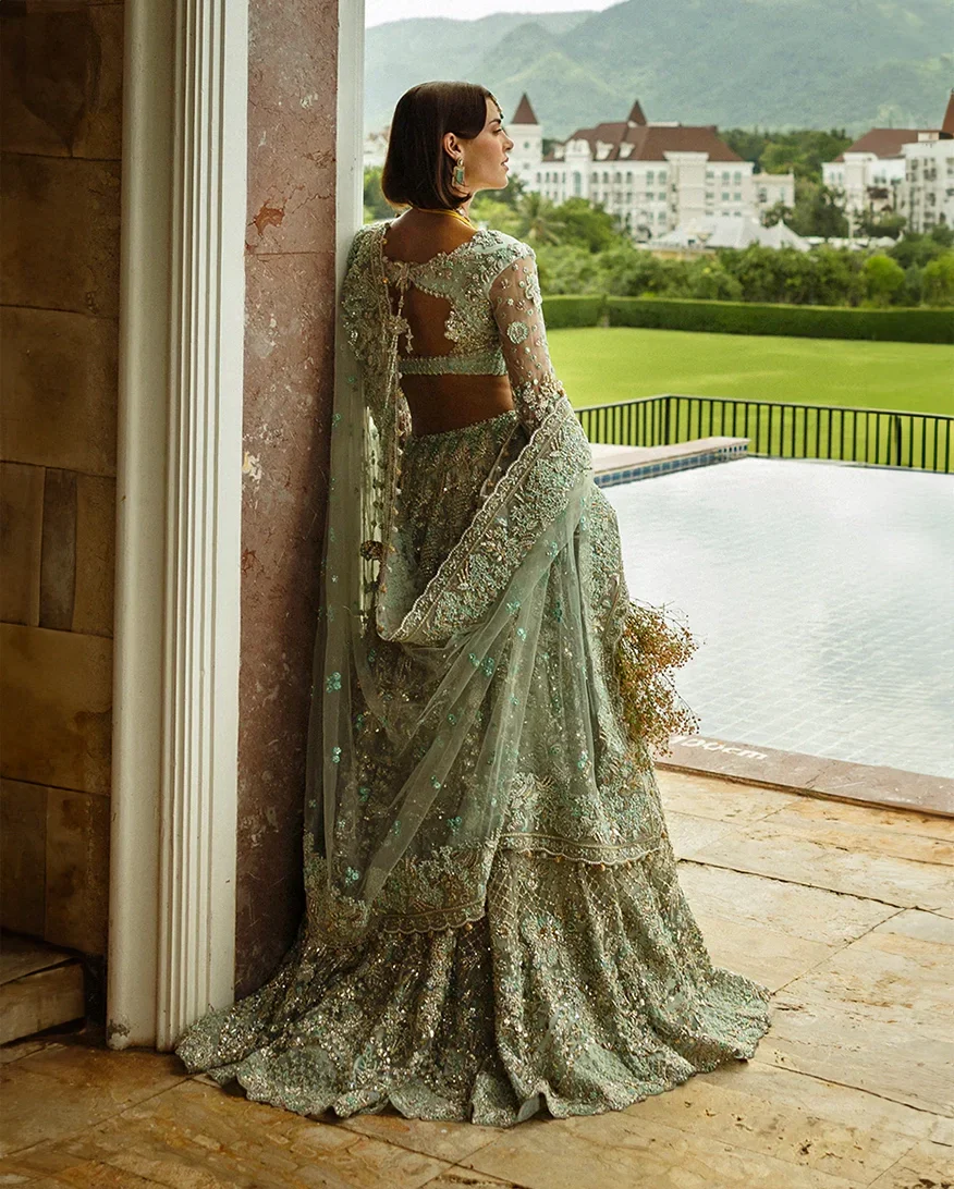 A symphony of romance in aqua green, Marcyln blooms with elegance. This delicate net lehenga-choli sparkles with dapka, naqshi, pearls, and Swarovski crystals, capturing the joy of a bride’s journey. With tassels and a pearl-sprayed back option, Marcyln is crafted to celebrate her love and the beginning of forever.