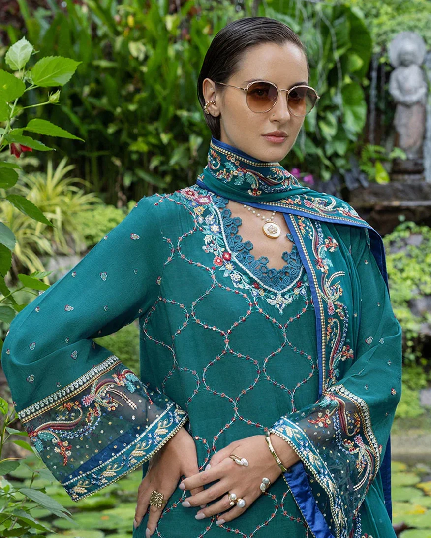 •   Embroidered, sequined chiffon dupatta border Â